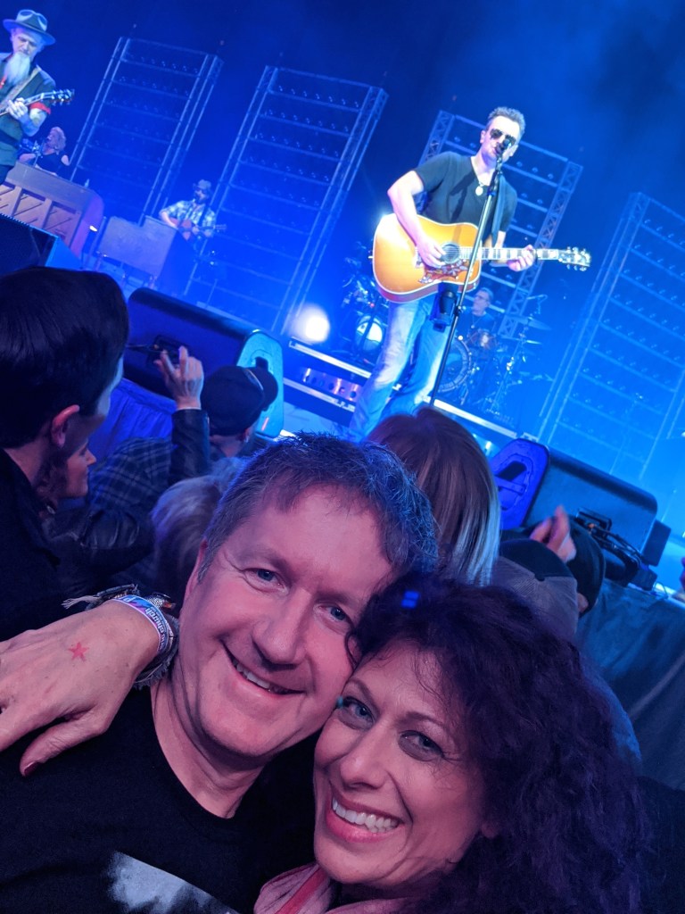 After tailgating, we made our way to the Pit line and waited amongst a group of more strangers that once again instantly felt like friends. It was finally time for the doors to open. I walked as quickly as my feet would take me to the special concrete area roped off for those of us coveting the paper tickets. I positioned myself, three standing rows back, directly in front of the center microphone. I looked around the fairly empty arena and smiled. I took a moment to take it all in. As I looked to my right, I was thrilled to see the couple from earlier in the day coming to stand beside us. As anticipated, it was going to take awhile before the concert started, so the girl and I sat down on the floor and struck up a memorable conversation. We shared how we came to be fans and what these artists mean to us. It was obvious that we “got” each other and that this music had seen us both through some rough times. As the crowd shuffled in and the lights start to dim, I grabbed Jim’s hand, rooted my feet to the floor, took a deep breath and smiled once again like a kid in a candy store. I heard someone whisper behind me “look how happy she looks”. In that moment, I was aware of the true happiness I was experiencing and the immense amount gratitude I felt in my heart. I vividly remember thinking, together Jim and I were celebrating the end of a rough ride. The last 13 months had taken us on a journey that included the loss of 2 parents, a friend, a dog, illnesses and surgery. And, although we look at the music that was about to be played from totally different perspectives, there is no doubt that at a variety of times over the last 13 months, this music has provided us both with joy, motivation, strength and comfort . Along this ride and through the attendance of 5 concerts in 7 months, from the nosebleeds to front and center, we rediscovered each other and started a new adventure that we can call 100% our own. We enjoyed the hell out of this final concert and boy am I glad that we did.