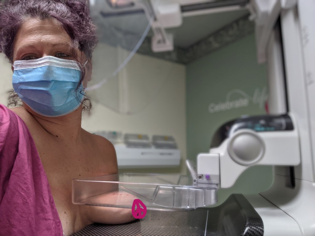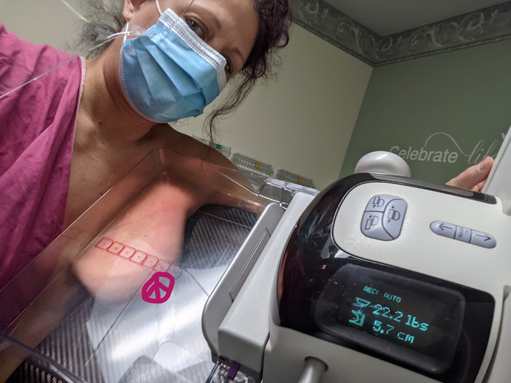 While we are on the topic of appointments, I want to talk about the Mammogram I had just before Christmas. The Breast Oncologist was adamant that I do NOT miss this appointment. If you are a BRCA patient or know a BRCA patient…forget that…if you have boobs……PLEASE PLEASE PLEASE, get your mammograms! I have read several articles recently that mention the decrease in scans due to COVID-19 and I cannot stress enough how important this test is. Consider checking with your mother, sister, grandmother, aunts, nieces, cousins and friends to see if they have gone this past year to be checked. If they have not, now is the time to remind them to schedule their appointments. Early detection can lead to positive outcomes and Lord knows we need all the positivity we can get right now. Okay….off my soapbox and back to the Mammogram. As my sister drove me to my mammogram, she shared with me she has never had one. This was not surprising to me really, as she is 11 years younger; however, what did surprise me a bit was that she had no idea what a Mammogram consisted of or looked like. It occurred to me WHILE I was having the scans that some of the young ladies who are diagnosed with a BRCA mutation may have no idea what this particular test entails. Even though it’s not exactly comfortable, it’s not terrible. It also does not take long. A little flattening, a little breath holding and a few clicks from the tech to take the pictures and you’re done. Since this could be my last mammo, I decided to take a couple pictures for posterity sake AND to show any female that hasn’t had the pleasure of turning her boob into a pancake, these pictures are for you. 😊
