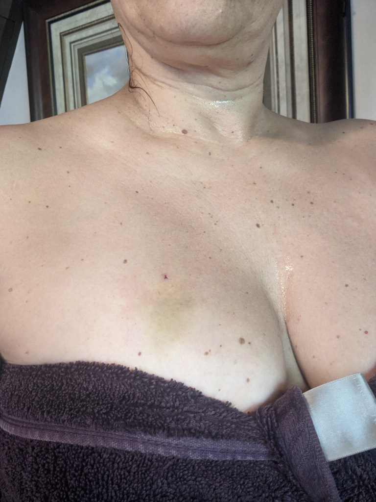 Another peek into reality. See the small red mark above the bruise? That is from the biopsy. If you ever have to have one, don’t stress. It wasn’t the worst thing ever, just don’t look when they insert the needle and keep talking to the techs. It helps tremendously.
