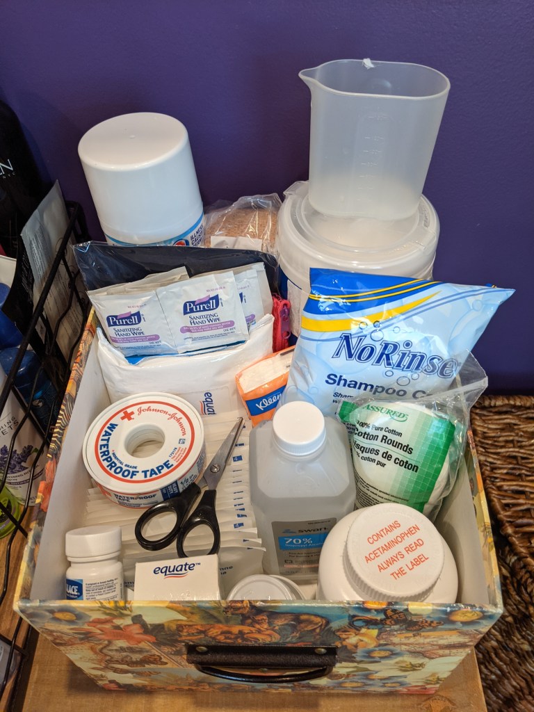 Once the fun was done, it was time to seriously prepare. This has been organized for my husband and will hopefully contain all he will need to tend to my wounds.