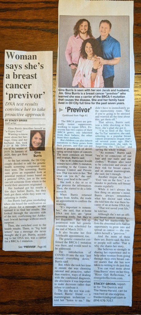 4.) My local newspaper (The Derrick) spotlighted my story with an article this week. It feels quite surreal getting to share my story. I am hopeful others will consider talking to their doctors and make the decision to check out their own genetics. Even if an individual does not take a radical path like I did, awareness can lead to early detection. And, early detection can lead to early treatment, which can save lives!