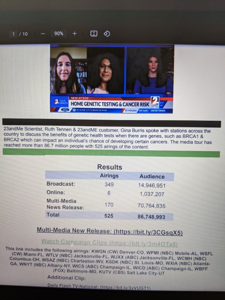 In my mind, it was going to be one interview that would be filmed, edited, and sent out to a few media outlets across the country. Although the thought alone made my stomach ache and sent my anxiety into a slight spiral, I believed I was up to the challenge. Then the details started to roll in. In a nutshell, I would be doing 28……. yep, you read that right….28 interviews in the span of 6 hours with reporters from across the country. Thankfully, a wonderful and much smarter than myself scientist from 23andme would also be part of the interviews and we would each be asked 2 questions. She was to handle the scientific and specific details regarding their direct-to-consumer genetic test, and I would be the real-life customer sharing my personal story. The nerves started to settle and once again I was certain I could do it. And then, these two tiny details came to light.