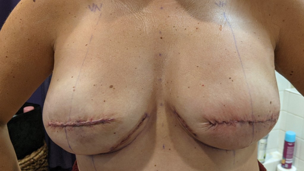 At this point, I am only a few days into healing and can already tell the size is going to be a better fit for me. Even with swelling, they are substantially smaller and lighter. Full recovery is going to take me a hot minute though. I don’t have much feeling in front, but there is plenty of feeling around the periphery. In all the places where scar revision took place, it feels like a hot iron is being pressed on my skin. A regiment of Tylenol and Ibuprofen takes the edge off. It’s the look that will take the longest to heal from, but I am hopeful that as the scars fade, the insecurities will fade too. As for today and a few tomorrows, I am going to allow myself some grace and a little room to be sad.