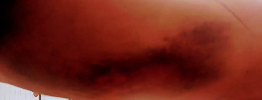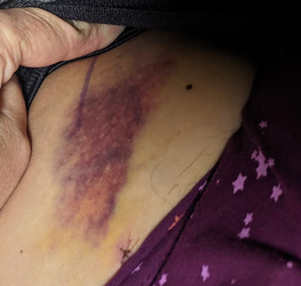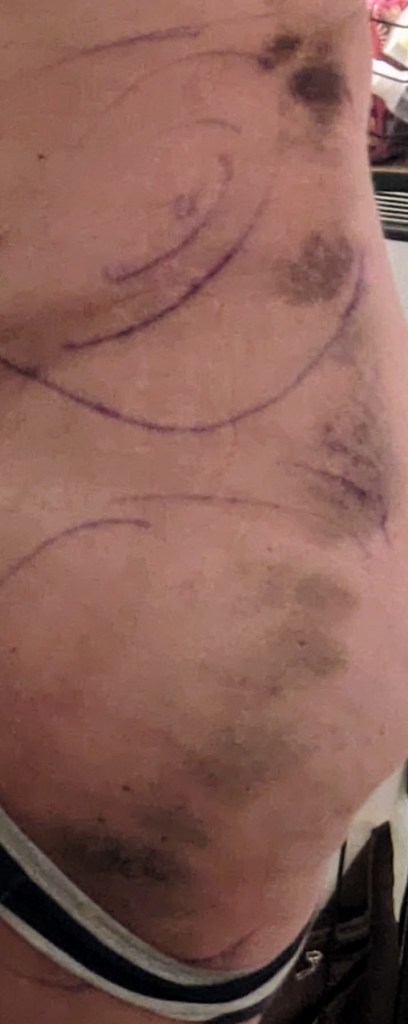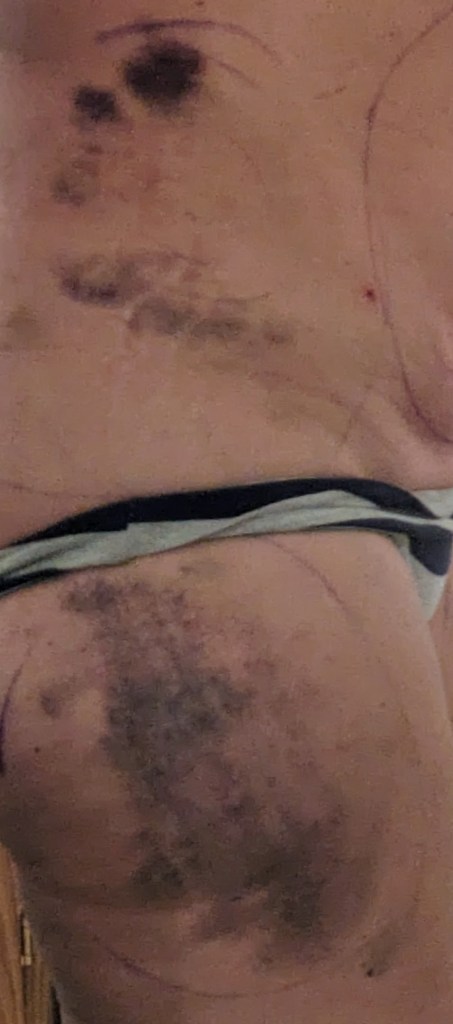Inner thigh. This bruise grew daily from day 1 of healing – day 5 or 6.